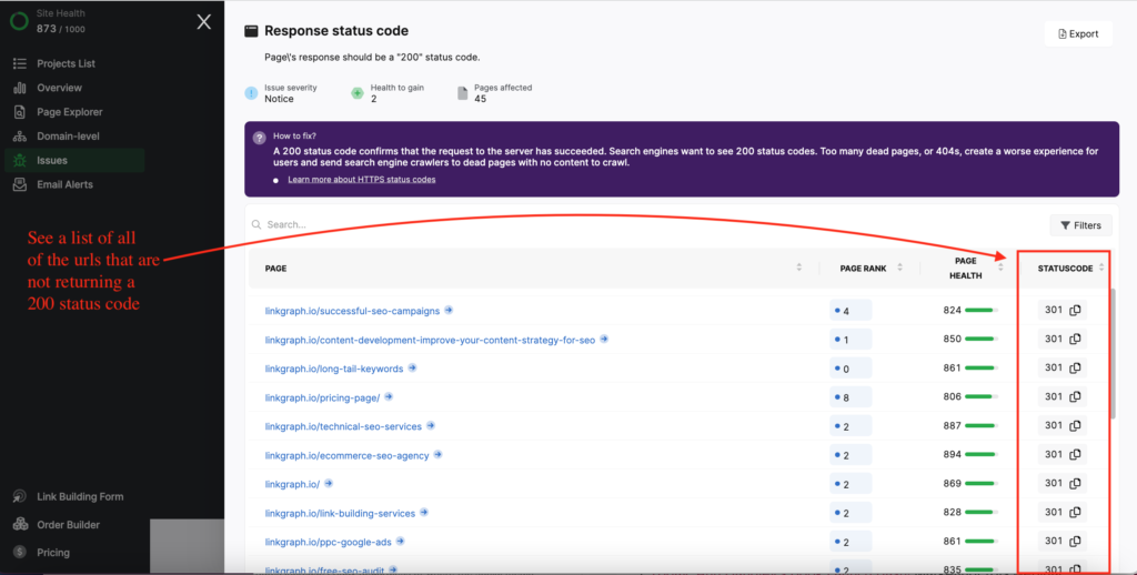 The Search Atlas Site Auditor will check the HTTP response codes of your webpages. It will also flag any issues it identifies in relationship to the status code.